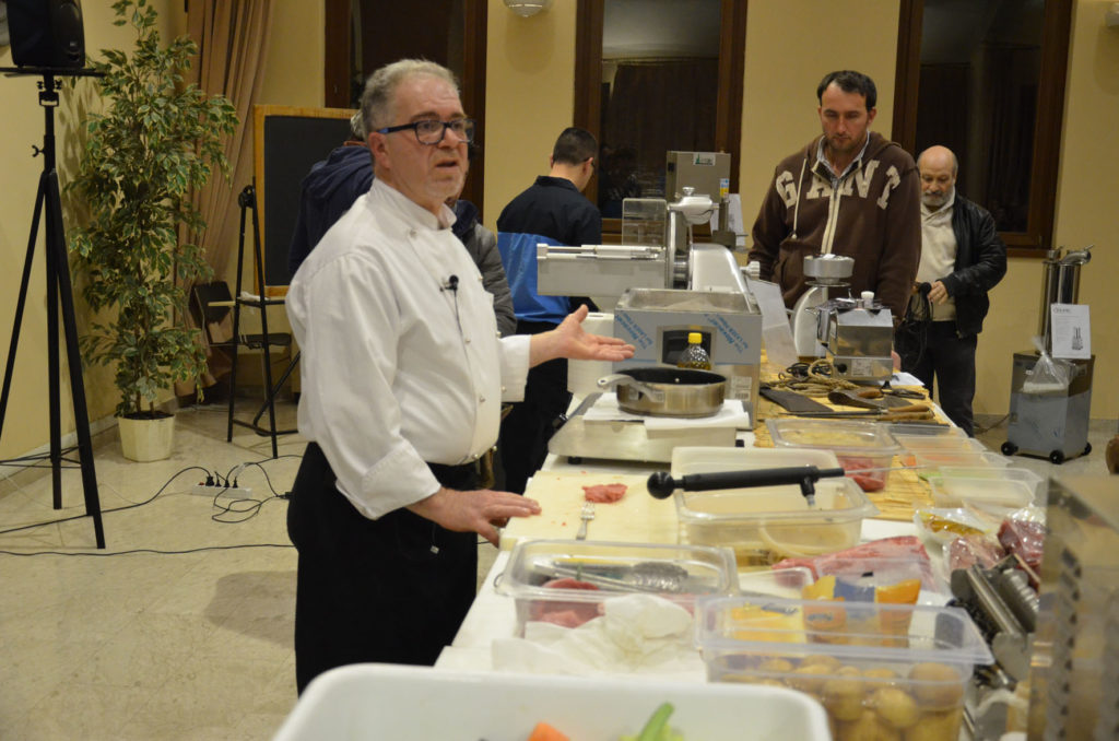 Donato D’Aurizio, cuoco macellaio, ha mostrato l’utilizzo di un innovativo cutter orizzontale mescolatore, di inteneritrici e dimostrato le potenzialità della cottura a bassa temperatura. Si è preparato un impasto per ripieno, un insaccato, un würstel, una carne in salamoia e alcune verdure e carni cotte a bassa temperatura. Donato, ha mostrato la semplicità d’utilizzo di queste nuove tecnologie e le grandi potenzialità d’impiego, per aiutare i professionisti del settore a soddisfare le sempre maggiori esigenze dei clienti. Al termine dell’incontro si sono degustate le preparazioni realizzate durante l’incontro e alcuni salumi offerti dall’Associazione Norcini Bergamaschi.