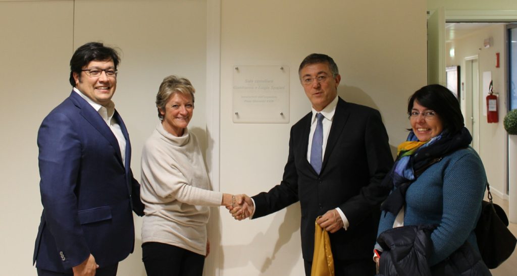 E’ stata ufficializzata nei giorni scorsi l’intitolazione a Gianfranco e Luigia Spajani della sala riunioni della Direzione generale dell’Ospedale Papa Giovanni XXIII. A loro si deve infatti la donazione al Comune di parte dei terreni su cui sorge il nuovo ospedale di Bergamo. Per ricordare la loro generosità è stata apposta una targa all’ingresso della sala consiliare che ospita le riunioni del Collegio di Direzione, le delegazioni italiane e straniere che vengono a visitare il Papa Giovanni XXIII, riunioni operative, conferenze stampa e incontri istituzionali.